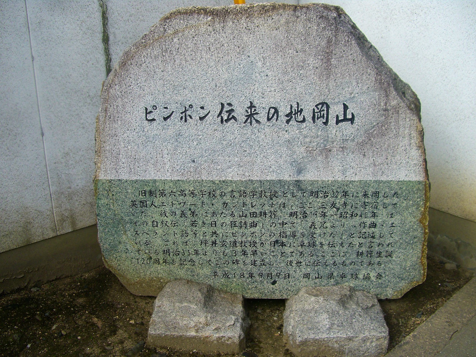 三友寺の門の左横にあるピンポン伝来の地の石碑(◎◎)