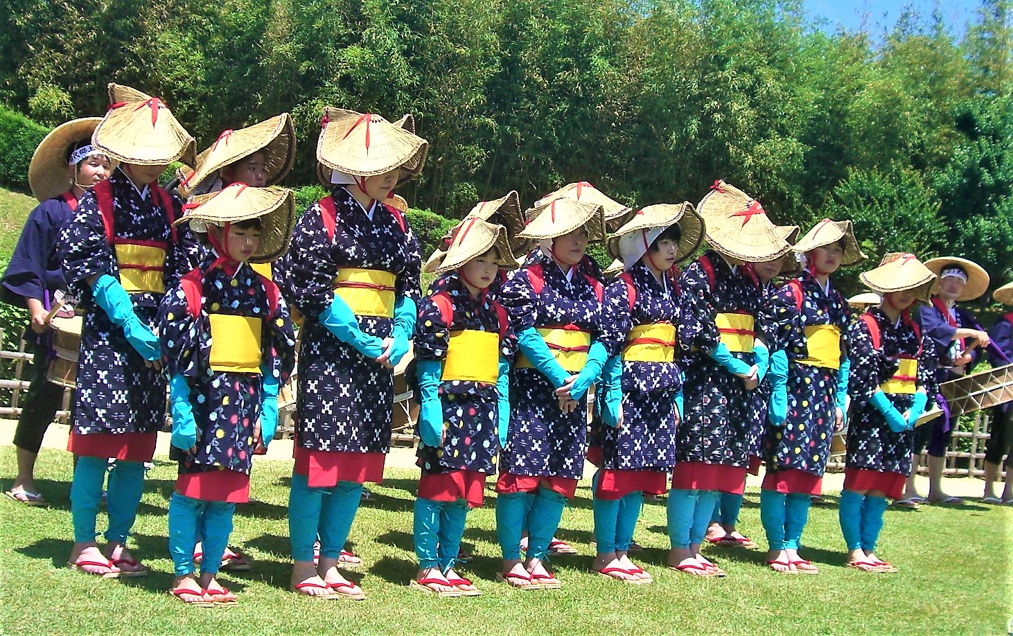 紺のかすりに赤だすき・菅笠の早乙女が男衆の太鼓と田植歌に合わせて昔ながらの田植えと田植え踊りを披露
